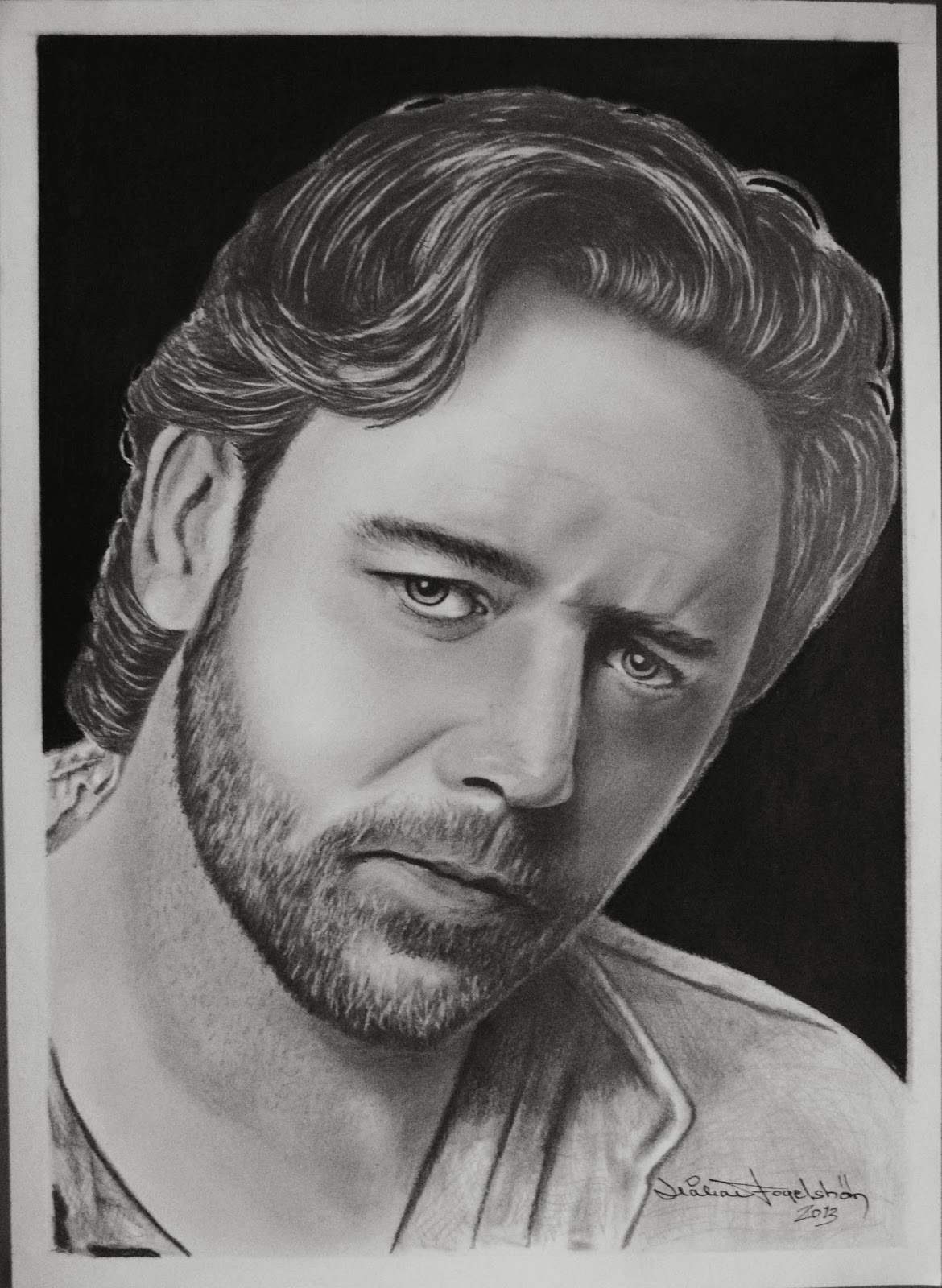 Russell Ira Crowe, född 7 april 1964 i Wellington Nya Zeeland, är en australisk skådespelare. I slutet av 90-talet slog Crowe igenom i Hollywood och därmed resten av filmvärlden. Här ritad på Canson 120gr. A3 papper med Koh-I-Noor blyertspennor 4H-2H-HB-2B-4B och Creta oljepenna svart (den mörka bakgrunden). Gillar du den? skriv en kommentar, det skulle jag uppskatta.